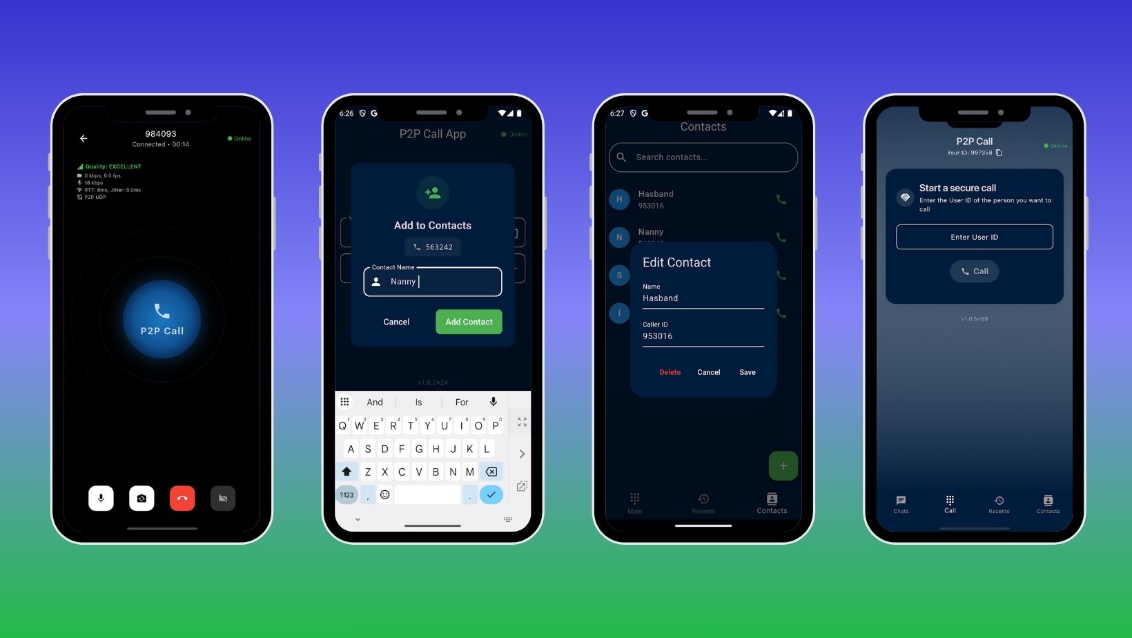 Наслаждайтесь частными высококачественными голосовыми и видеозвонками без необходимости создания учетных записей или использования сложной инфраструктуры. Приложение P2P Call, построенное на технологии peer-to-peer, обеспечивает бесперебойную и безопасную связь непосредственно между пользователями и работает с любыми телефонными номерами по всему миру.
